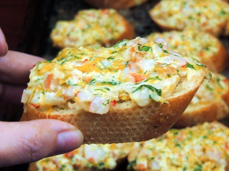 - Spoon 1-3 shrimp with Alfredo sauce onto each slice of bread and sprinkle with Mozzarella cheese. Continue with each piece of bread.
