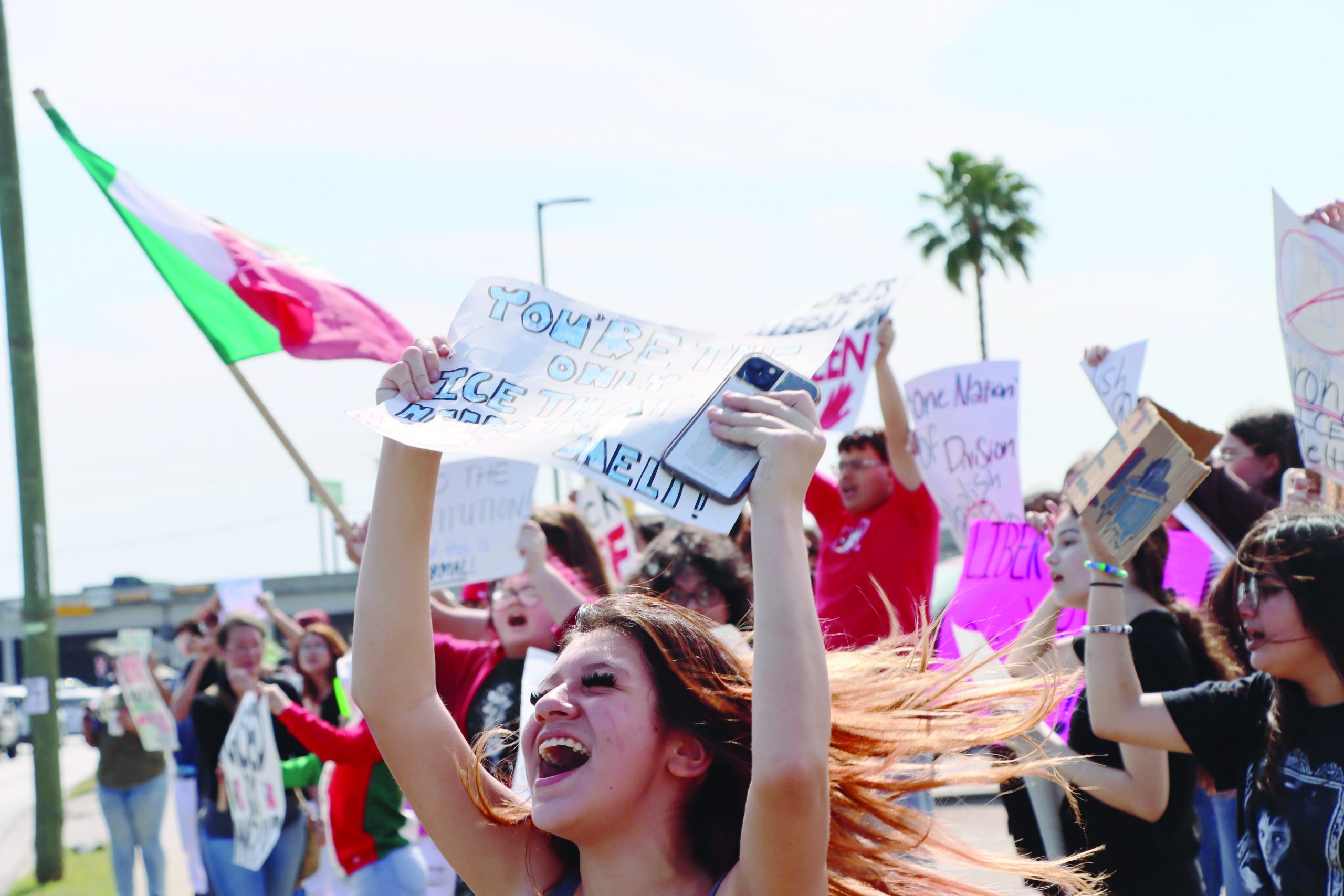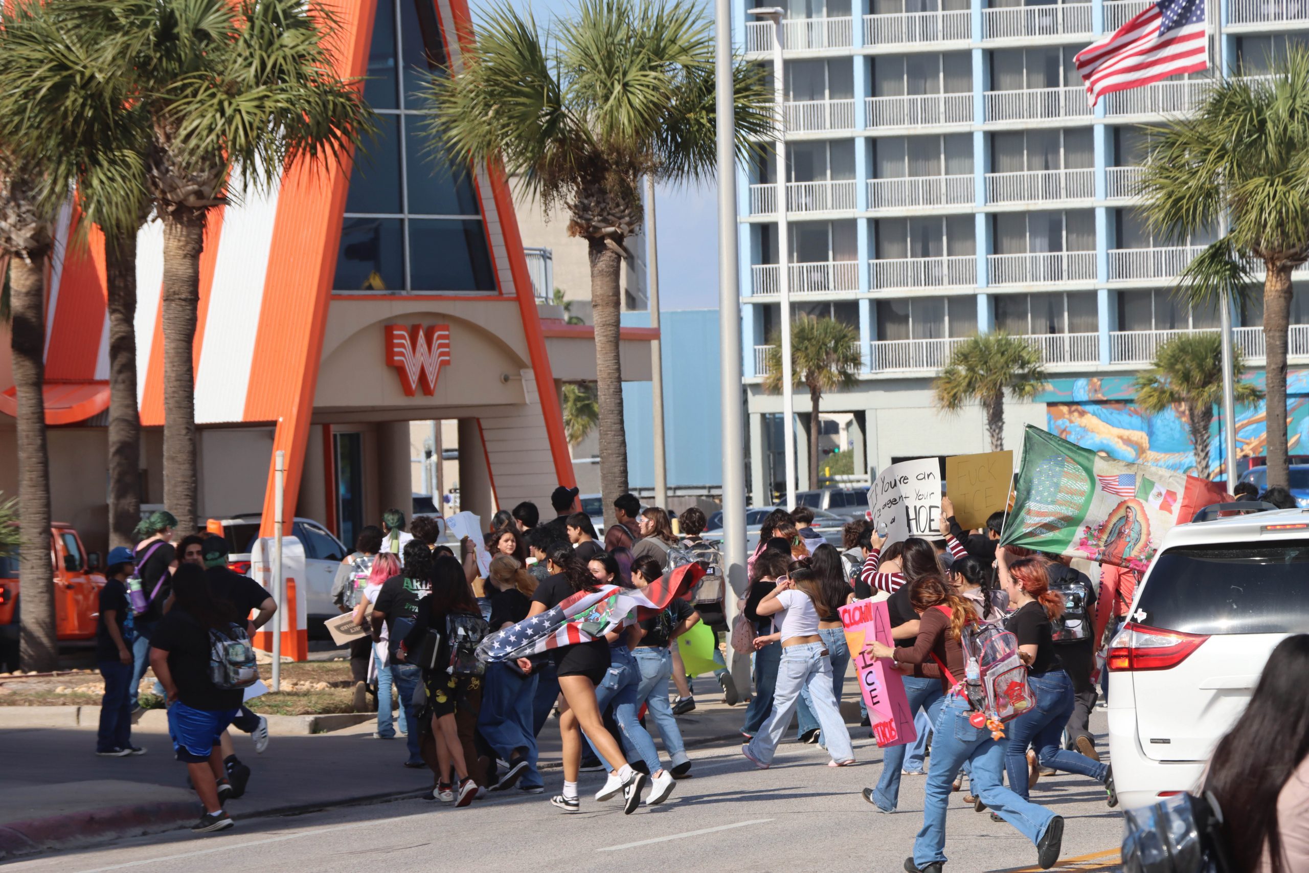 King students walked from Mustang Trail to South Staples Street near South Padre Island Drive outside of La Palmera Mall, holding hand-lettered protest signs as cars honked in solidarity.